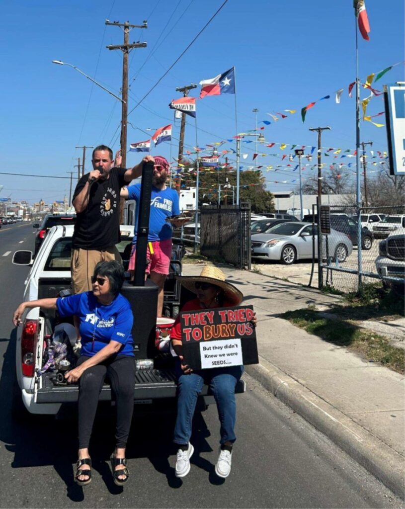 We began at a migrant memorial site on the southwest side of San Antonio that marks the place where, in 2022, 53 people, including children, died in sweltering Texas heat after smugglers abandoned them in the back of an 18-wheeler without air conditioning or proper circulation. Indigenous elders representing communities that have survived generations of genocide, forced removals, and incarceration led the procession as we walked.