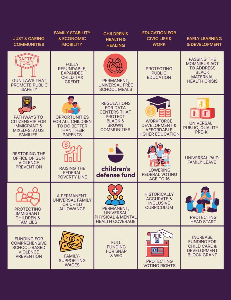 Every president, no matter their party, should work with Congress to prioritize the well-being of all young people. Use our BINGO card to evaluate the impact of the president’s actions over the last year on children and families. If the president mentions something in one of the squares below, mark it!